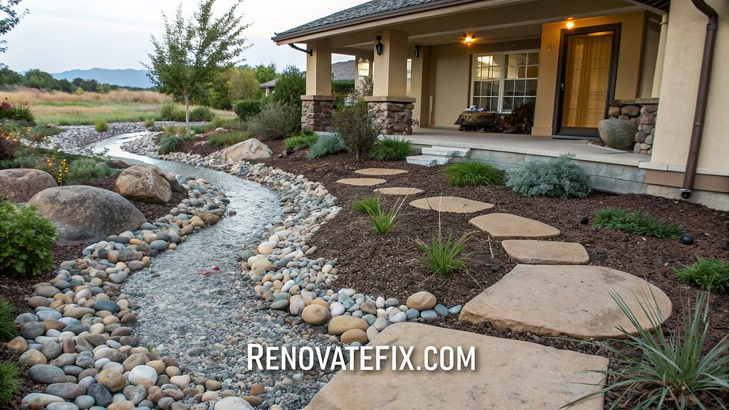 Mimic natural water features through strategically placed river rocks arranged in winding patterns suggesting seasonal water flow.