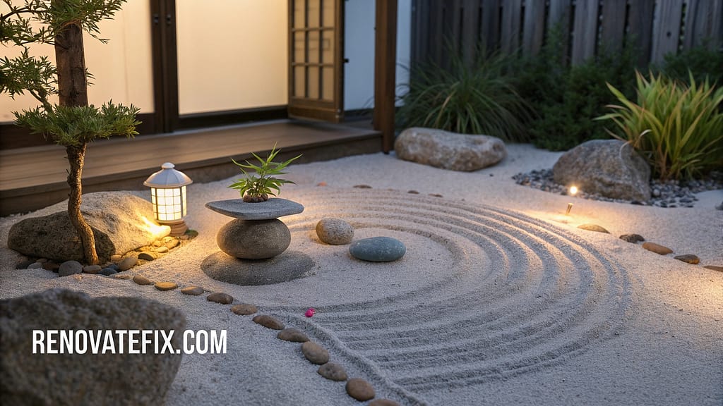 Carefully raked small pebbles surround central sitting stones positioned for optimal sunrise viewing.
