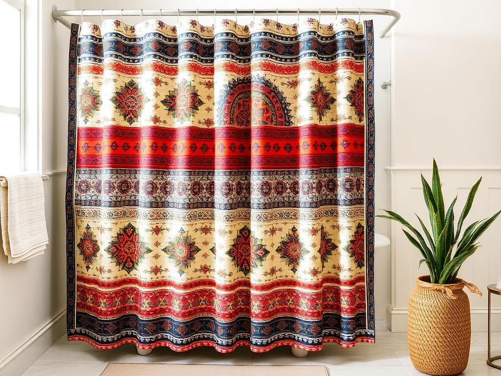 Capture the essence of bohemian style with a shower curtain featuring intricate patterns and earthy tones.