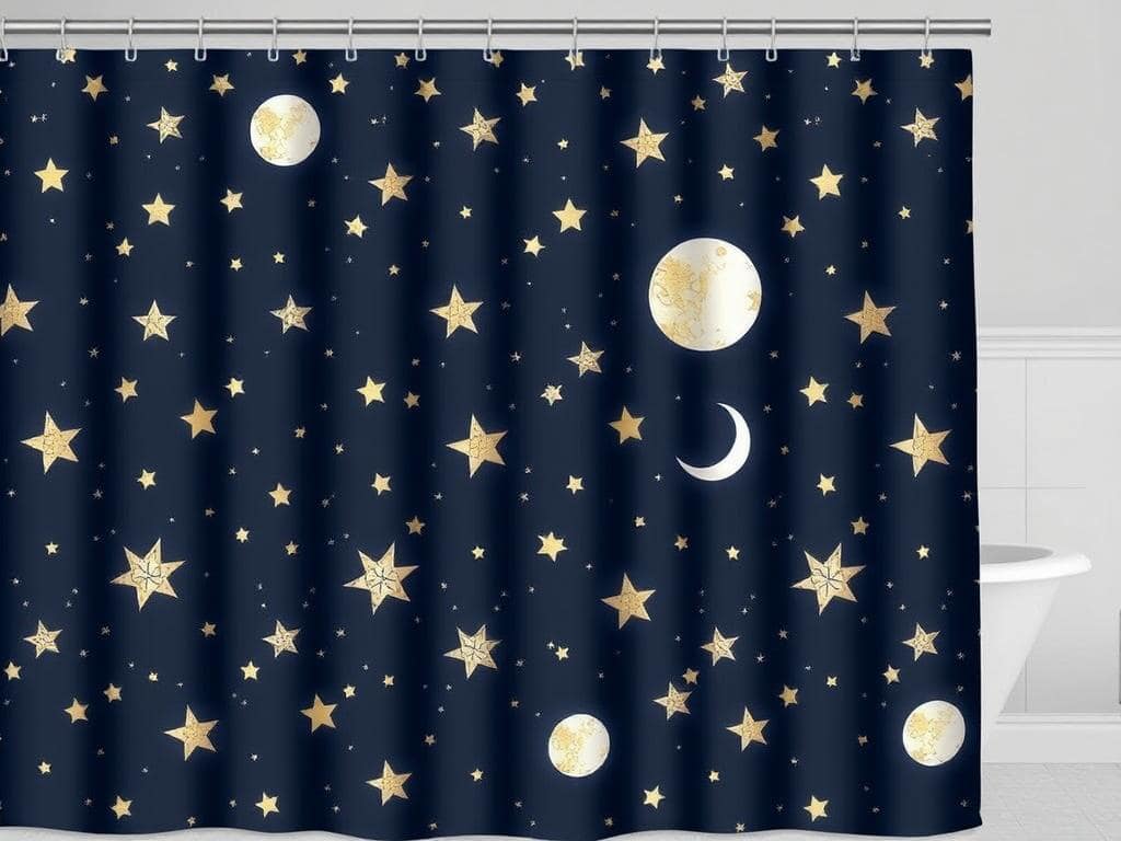 Transform your bathroom into a cosmic retreat with a celestial-themed shower curtain featuring stars, moons, and galaxies.