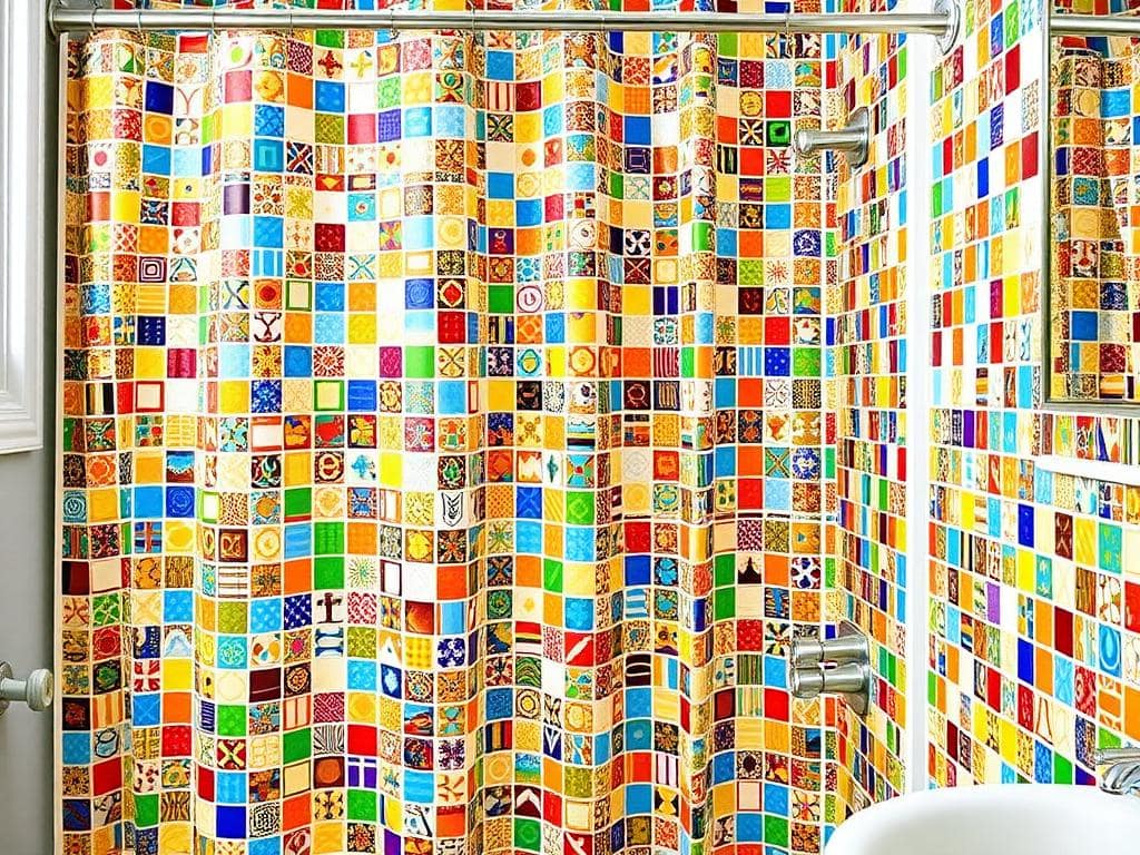 Add a splash of color to your bathroom with a mosaic-patterned shower curtain.