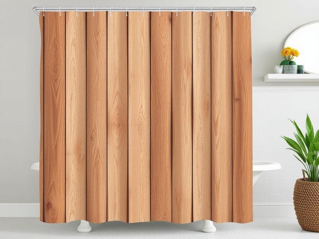 Bring the warmth of nature indoors with a rustic wood shower curtain that mimics the look of reclaimed wood planks.