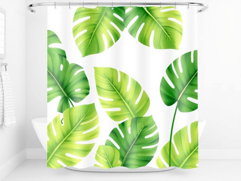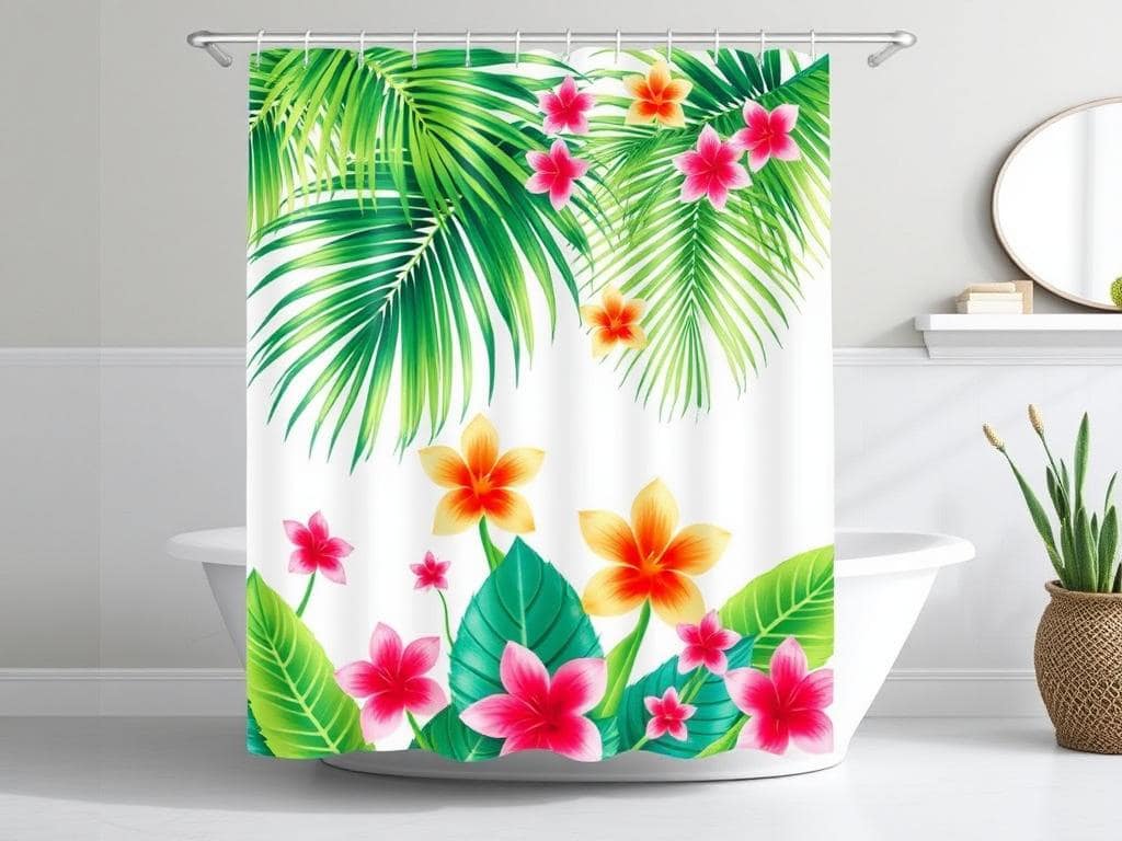 Bring the essence of a tropical getaway into your bathroom with a shower curtain adorned with lush palm leaves and vibrant flowers.