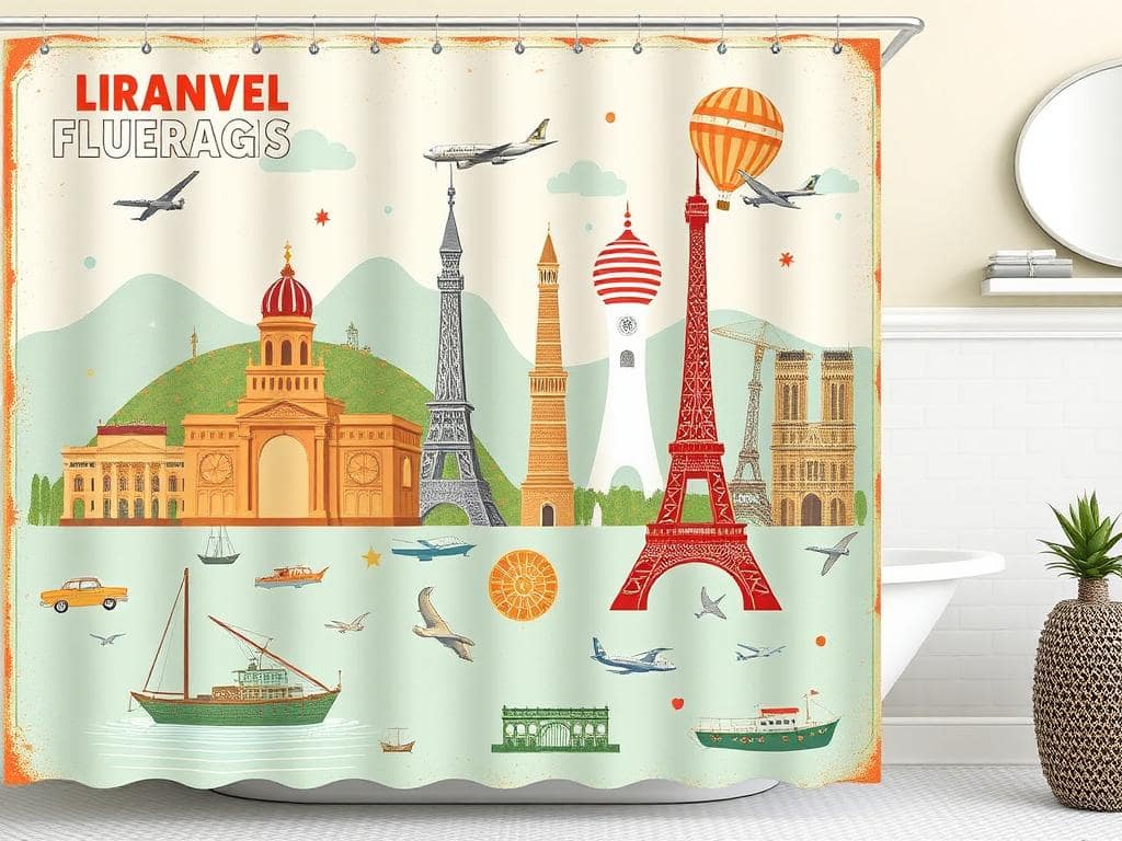 Take a trip down memory lane with a vintage travel-themed shower curtain.