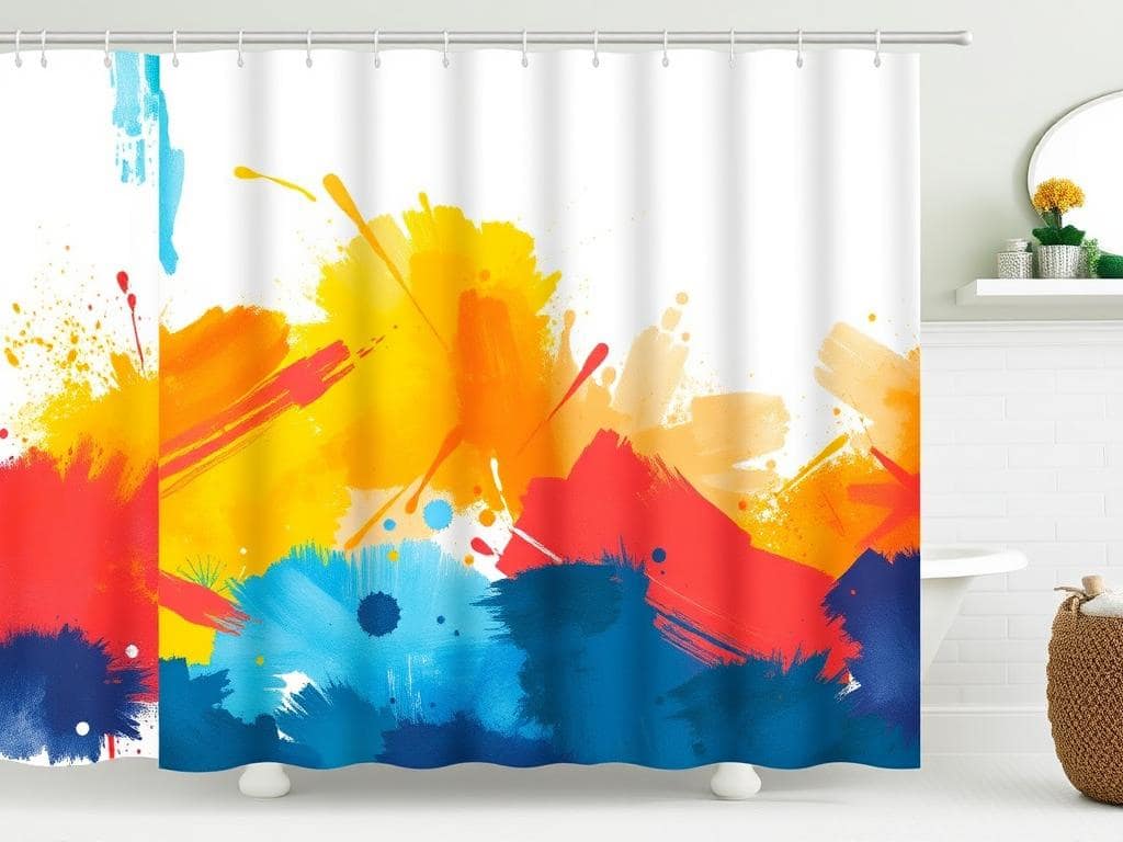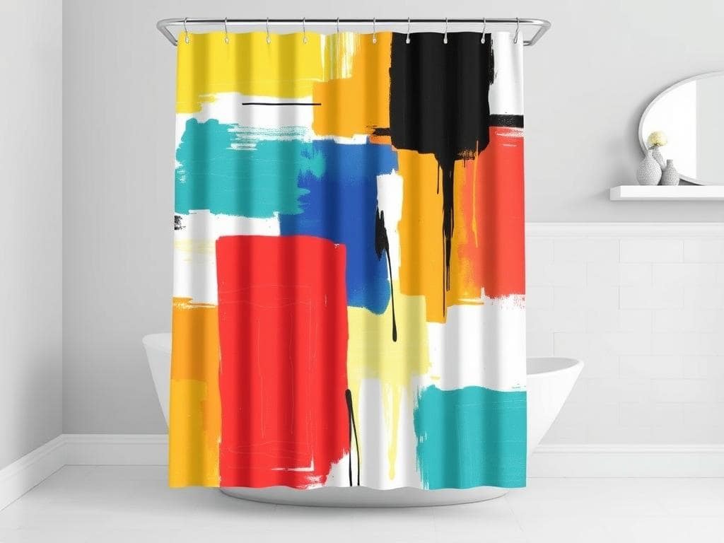 Make a bold statement with an abstract art shower curtain that showcases vibrant colors and dynamic shapes.