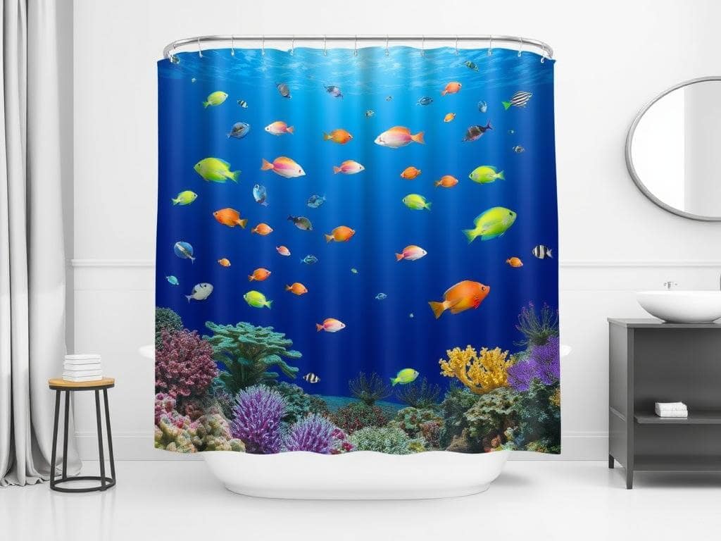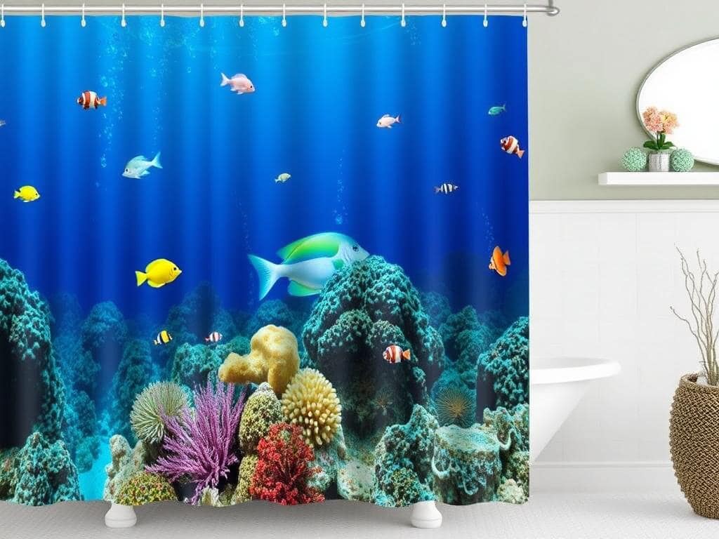 Dive into a vibrant underwater world with a shower curtain that features marine life and coral reefs.