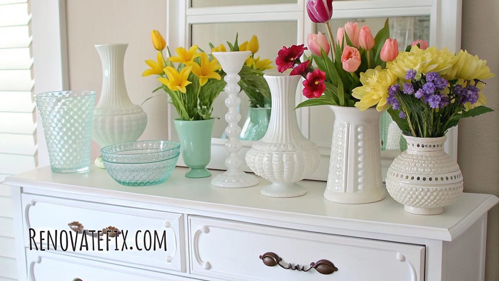 Gather vintage milk glass vessels from thrift stores and antique shops, creating striking monochromatic groupings that showcase spring flowers against crisp white backgrounds.