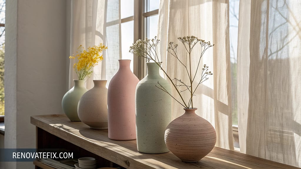 Arrange collected pastel ceramic vessels in varying heights along windowsills or shelving, creating cohesive color stories throughout rooms.