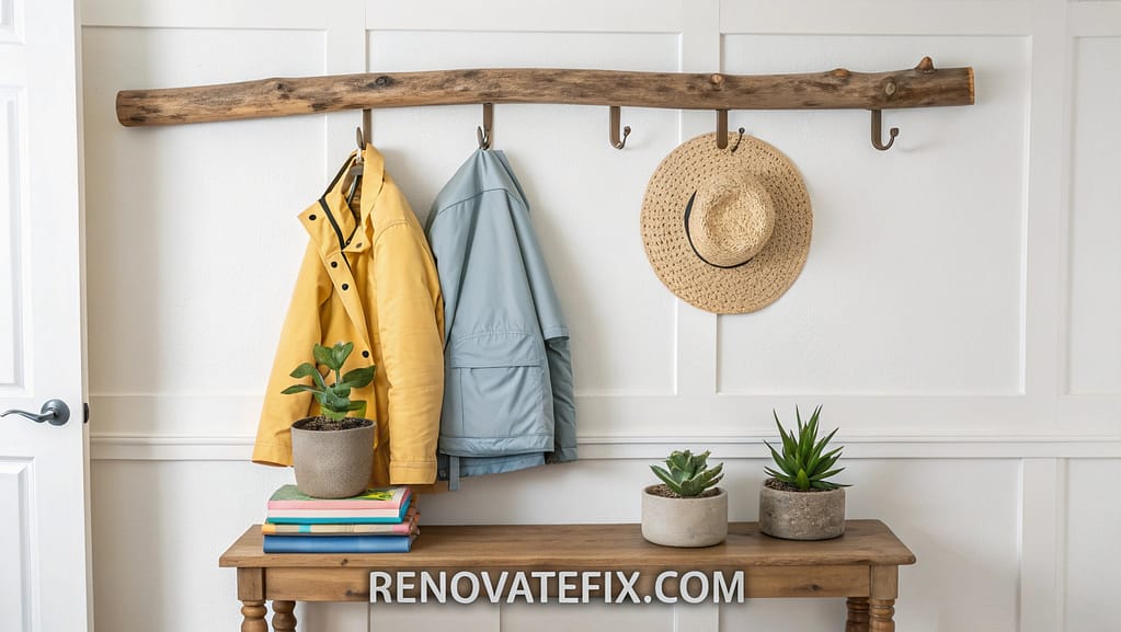 Mount found driftwood pieces fitted with sturdy hooks, creating functional art that serves as unique wall storage for light jackets, scarves or hats while bringing natural elements indoors.
