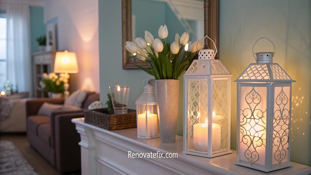 Position frosted glass lanterns with LED candles along mantels, stairs, or outdoor spaces, creating magical evening ambiance that transitions beautifully between indoors and gardens.
