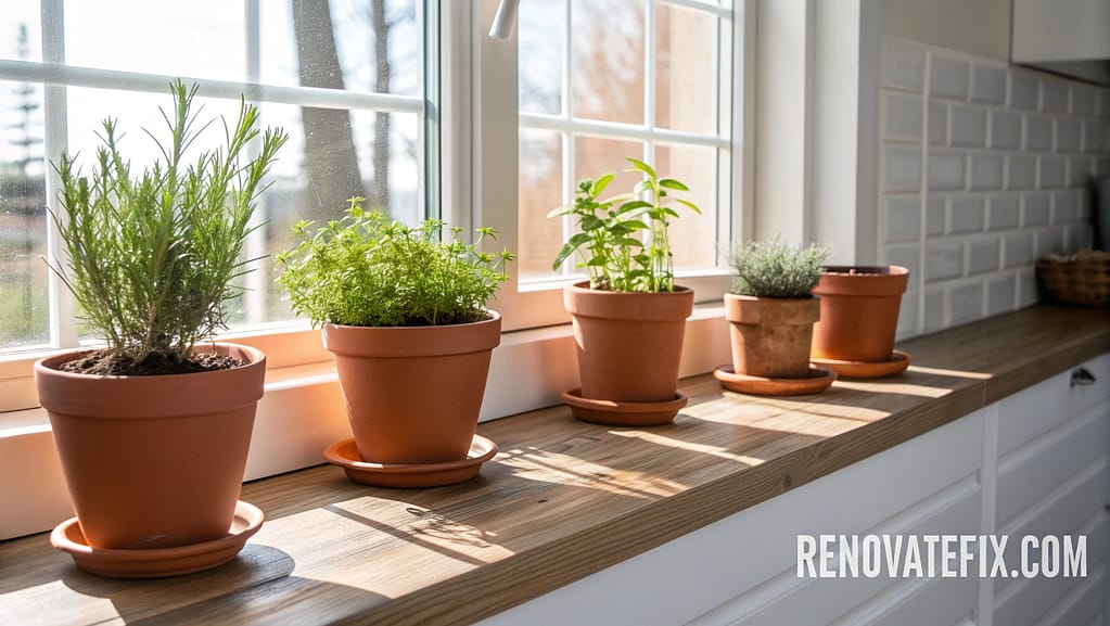 Establish mini herb gardens along kitchen windowsills using coordinated terracotta pots filled with basil, mint, chives and cilantro, combining functionality with vibrant greenery.