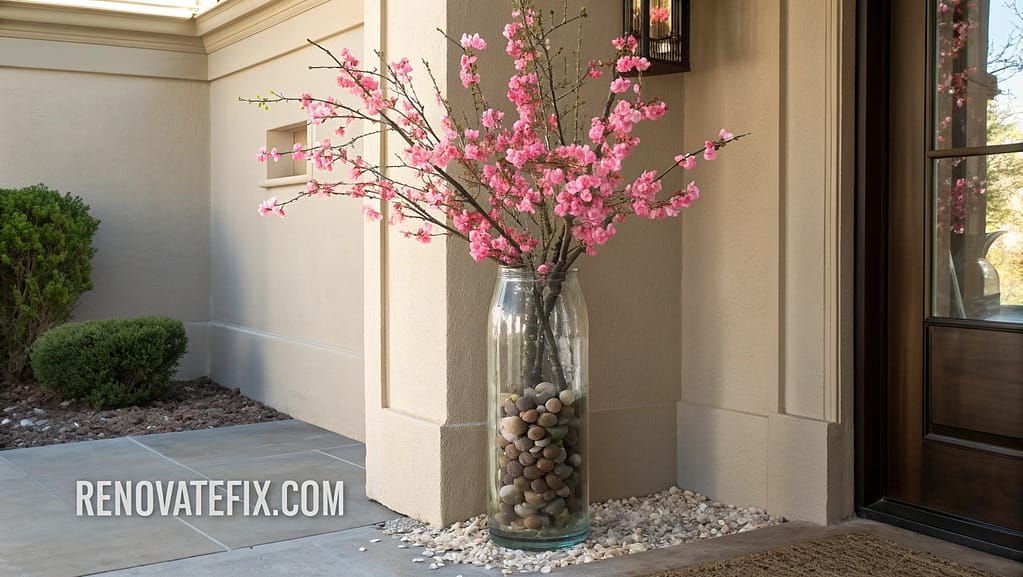 Create lasting spring impressions with quality silk cherry, magnolia or forsythia branches arranged in tall cylindrical vases, providing height and seasonal color without maintenance requirements.