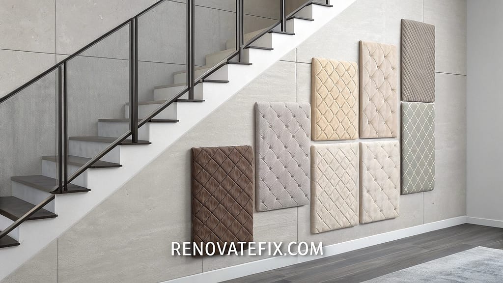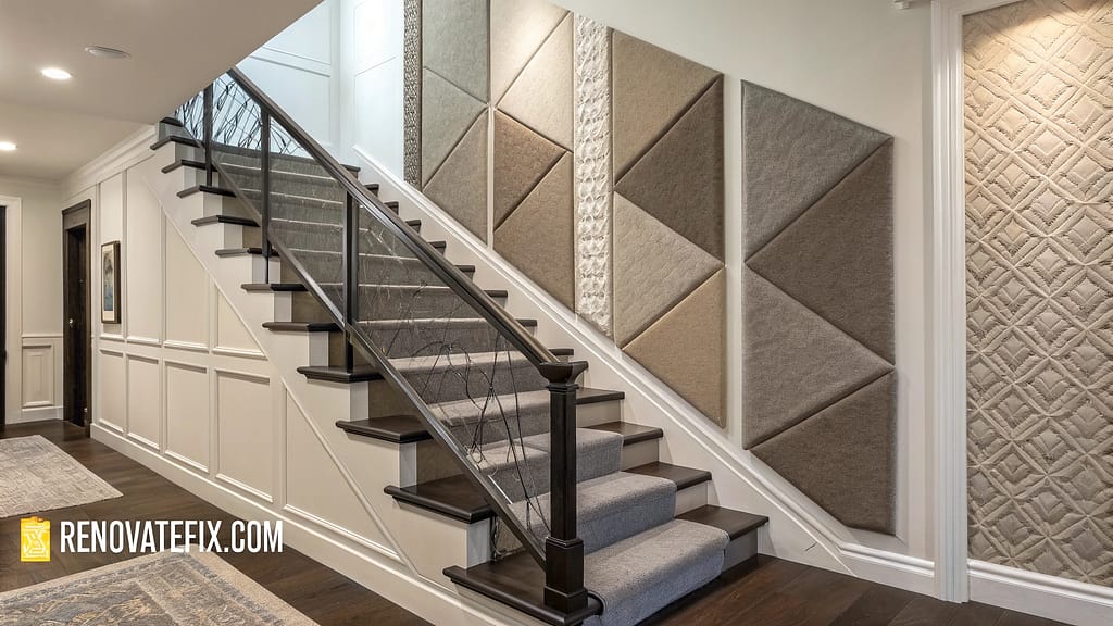 Soft fabric panels introduce tactile richness and acoustic softness to stairway environments.