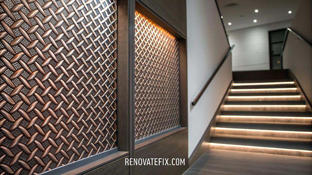 Metallic mesh panels introduce an edgy, industrial aesthetic with intricate woven textures that catch and reflect light dynamically.