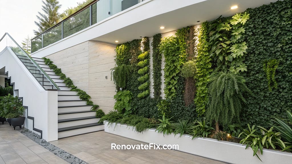 Vertical gardens transform stairway walls into living, breathing ecosystems with carefully curated plant species.