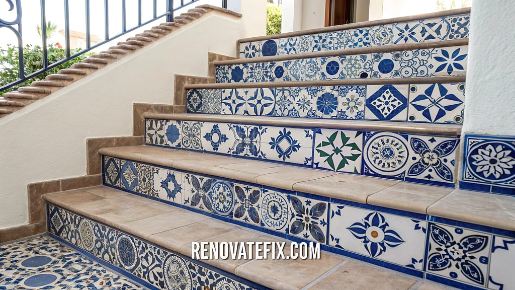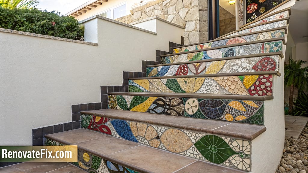 Hand-crafted ceramic tiles form intricate visual compositions, transforming stairway walls into vibrant artistic canvases.