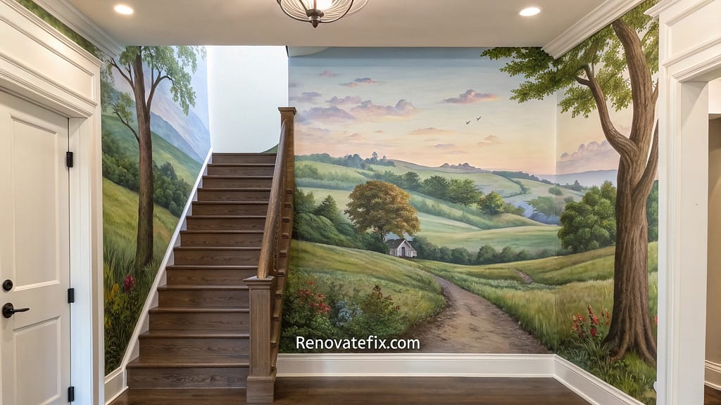 Large-scale landscape paintings transform stairway walls into immersive natural environments.