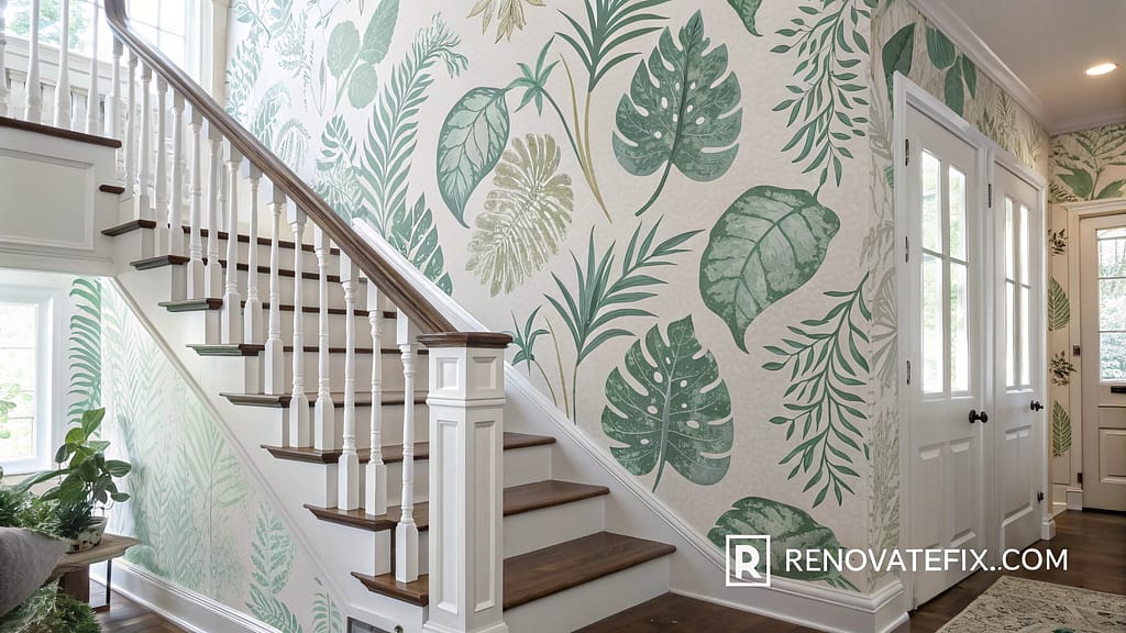 Delicate leaf patterns and exotic flora create a verdant vertical journey that transforms mundane transitions into botanical expeditions.