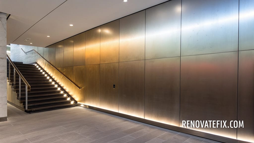 Sophisticated metal finishes with subtle color transitions create luxurious vertical surfaces.