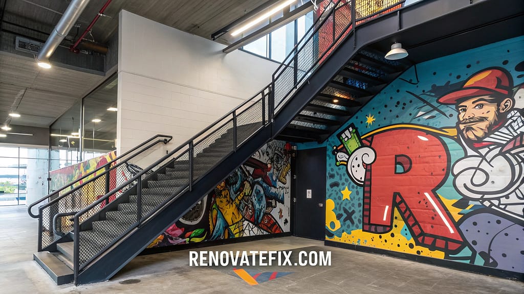 Urban artistic expressions transform stairway walls into vibrant creative canvases.