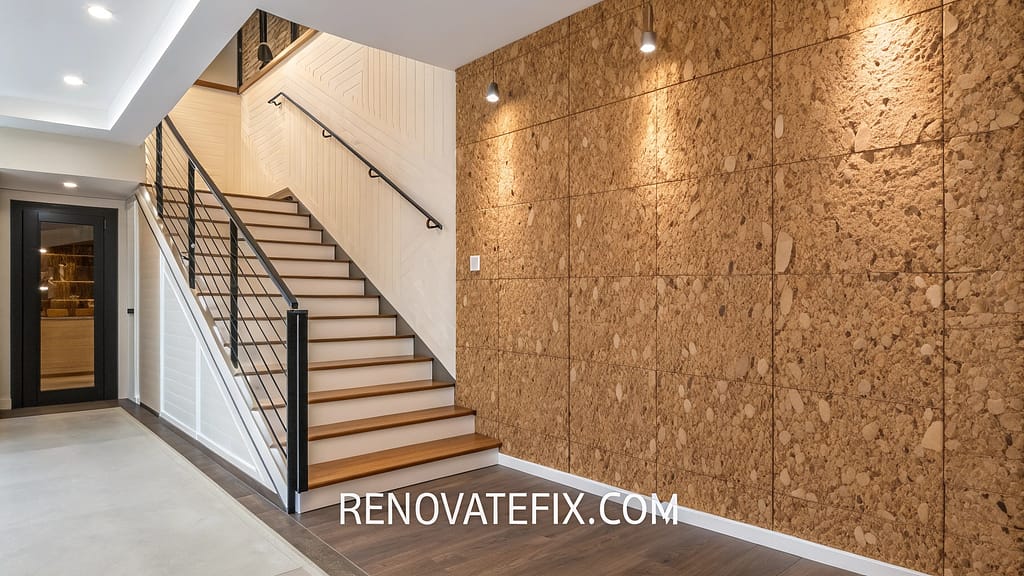 Eco-friendly cork surfaces bring natural texture and acoustic properties to stairway environments.