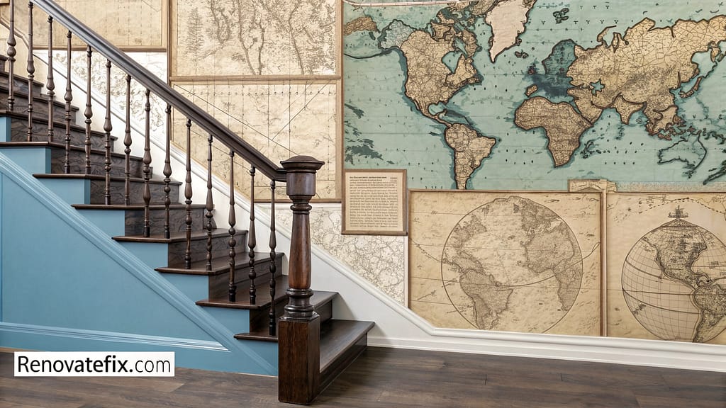 Carefully curated vintage cartographic illustrations transform stairway walls into a global storytelling canvas.