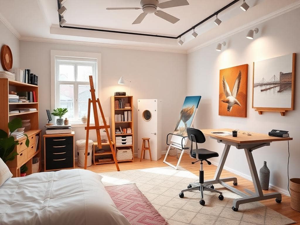 Transform the space into an artist’s haven with easel corner, supply storage, and gallery lighting.