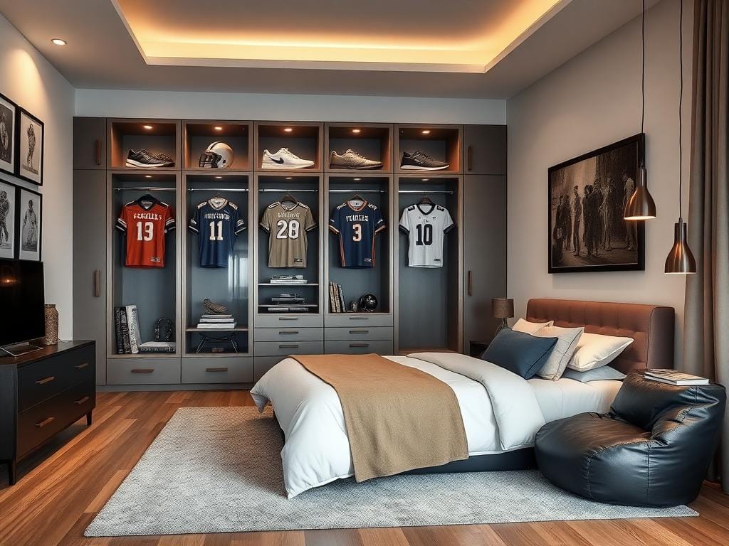 Showcase team colors and memorabilia in a sophisticated way with custom display cases and vintage sports equipment as wall art.
