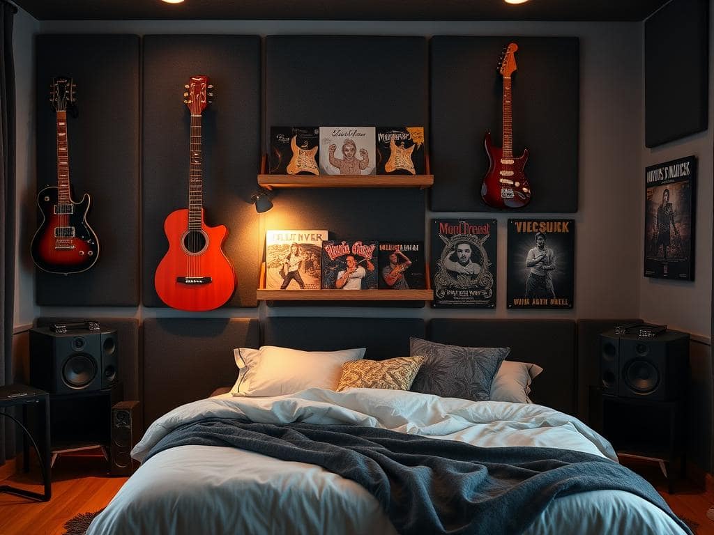 Transform the space into a mini recording studio with acoustic panels, instrument display mounts, and a dedicated practice area.