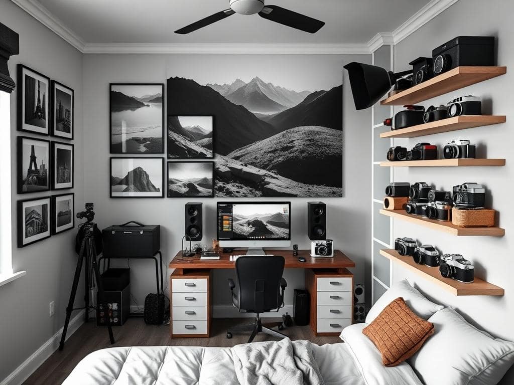 Transform the space with nature photography displays, camera gear storage, and editing station.