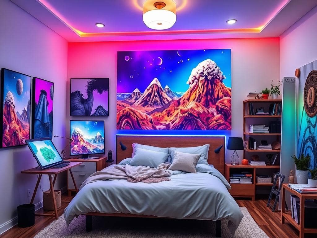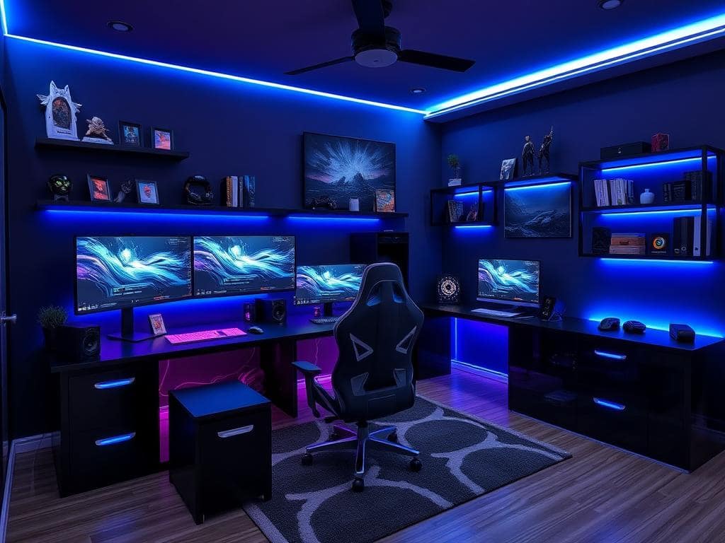 Design a dedicated gaming zone with LED strip lighting, floating monitors, and ergonomic seating.