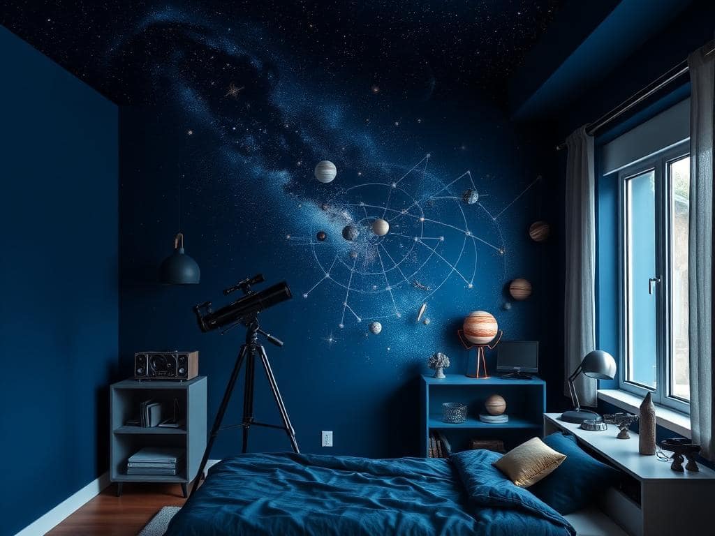 Create a space-viewing themed room with telescope station, constellation maps, and planetary models.