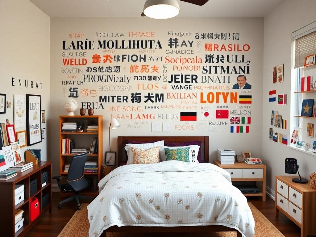 Create a multicultural space with international text art, language learning station, and cultural displays.