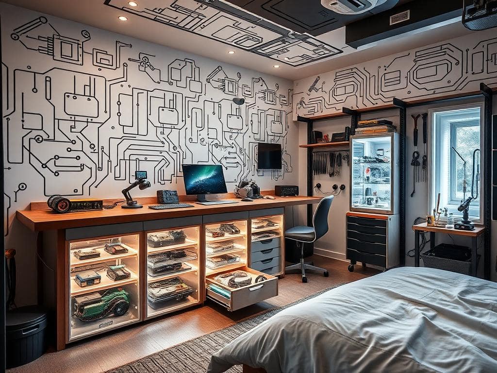 Transform the space into an inventor’s laboratory with workbench area, component storage, and circuit board artwork.