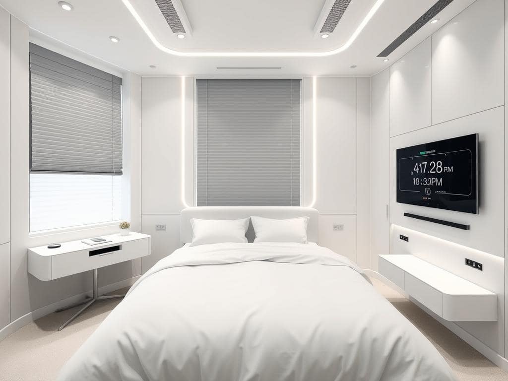 Create a smart bedroom with integrated home automation, wireless charging stations, and interactive displays.