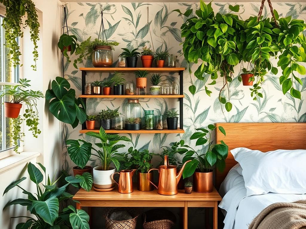 Incorporate indoor plants, natural materials, and greenhouse elements. Include plant care station and botanical artwork.