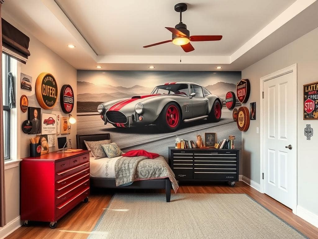 Design with classic car memorabilia, tool-inspired storage, and industrial elements.