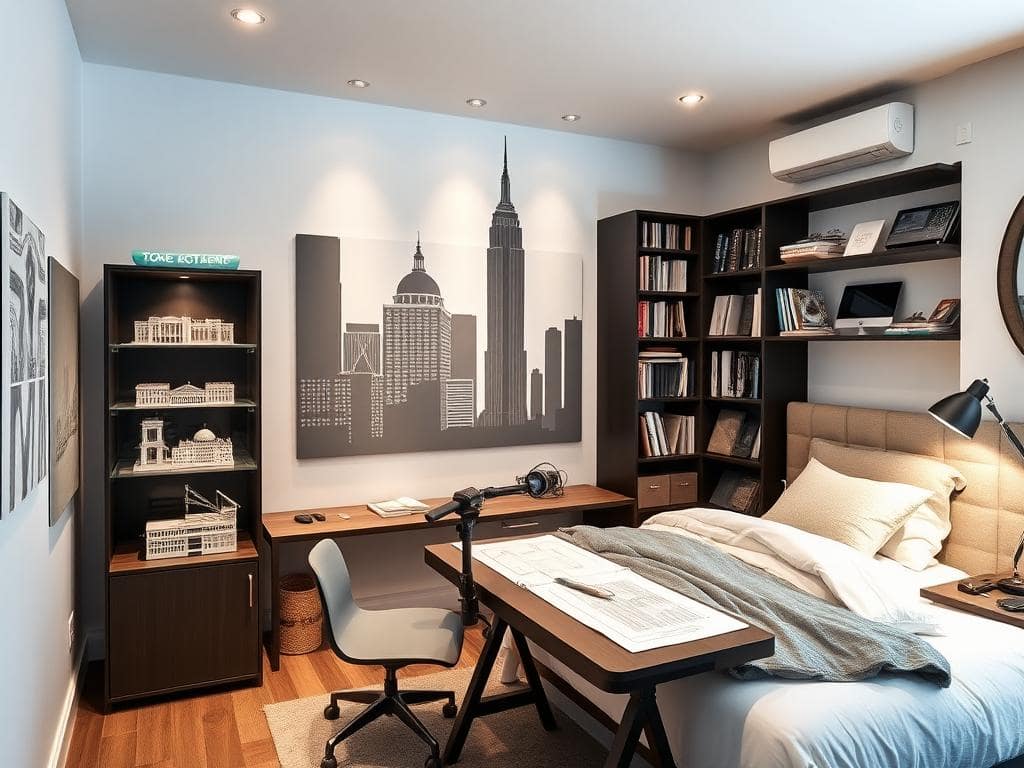 Create a designer’s workplace with drafting station, scale model displays, and architectural element artwork.