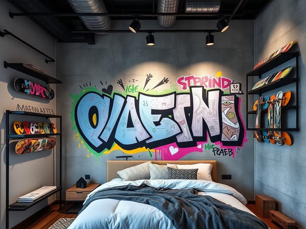 Showcase professional graffiti art murals, skateboard deck displays, and urban photography.
