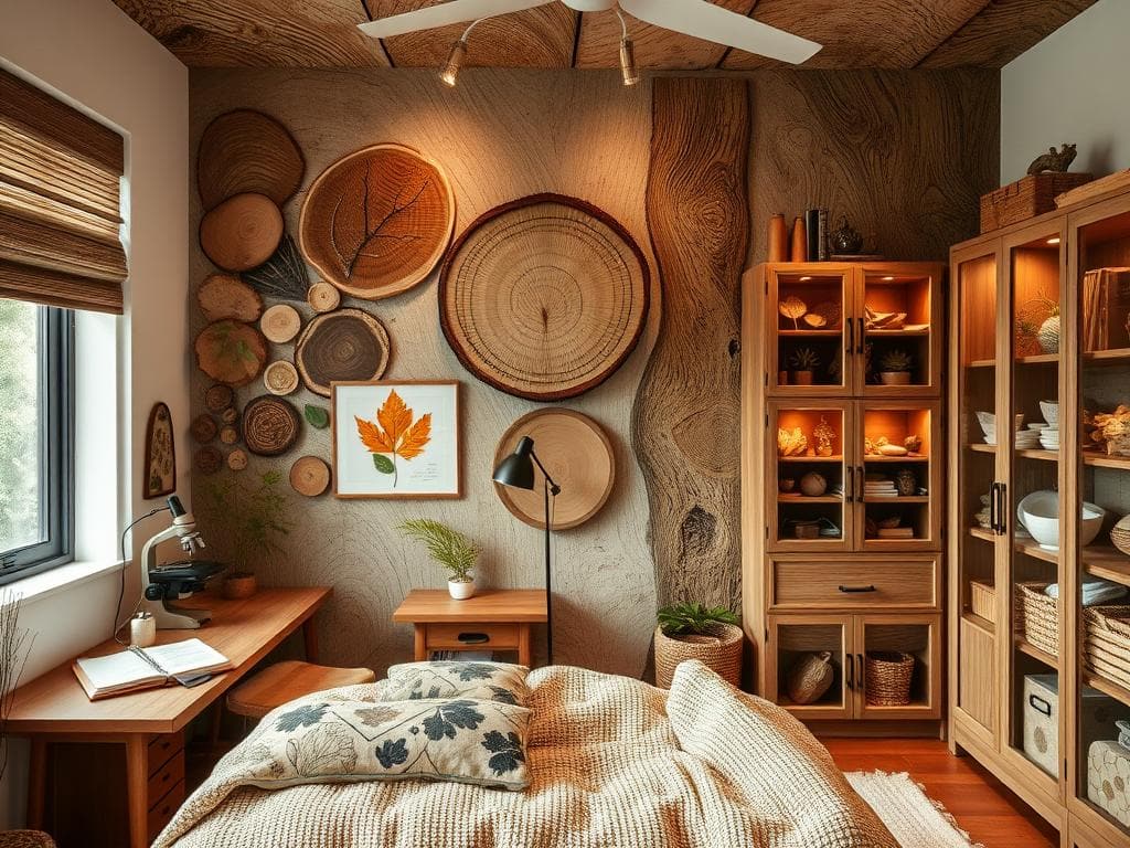 Design a nature researcher’s retreat with bark-textured walls, cross-section wood displays, and specimen collection areas.