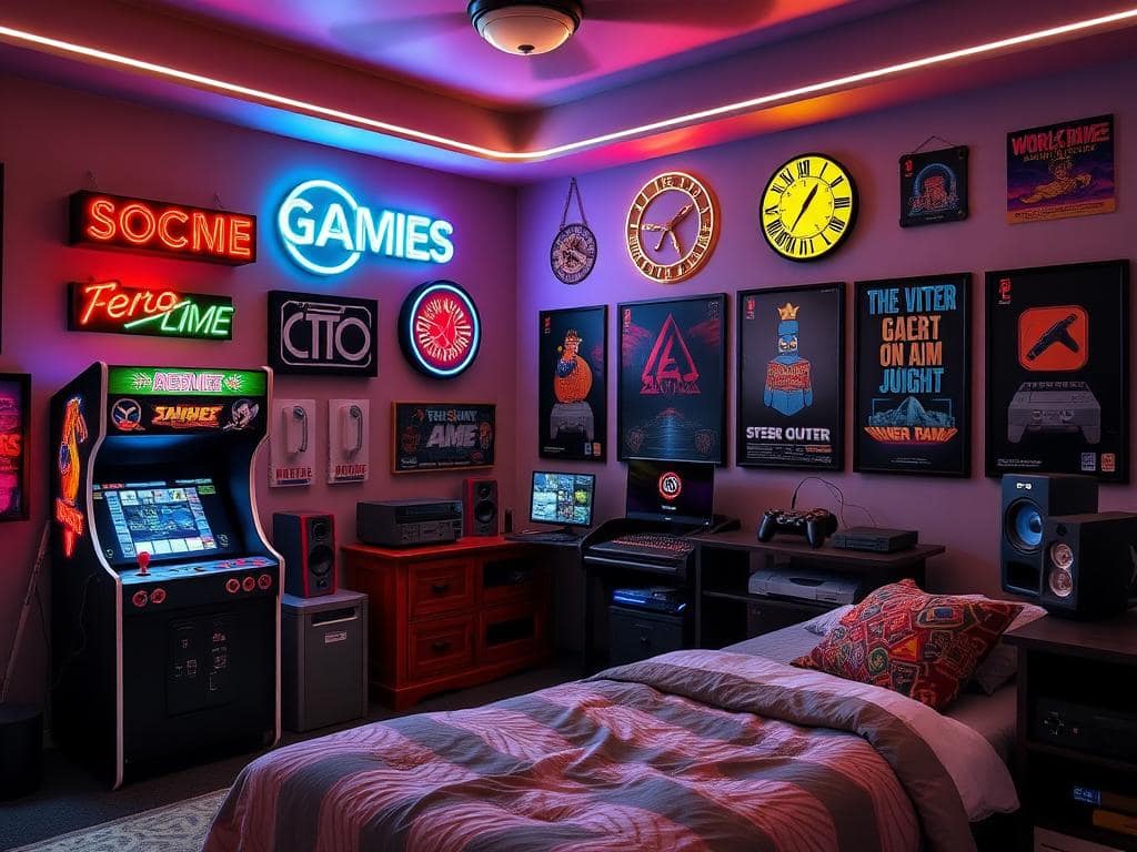 Design a vintage arcade experience with classic game cabinets, neon signage, and LED strips.