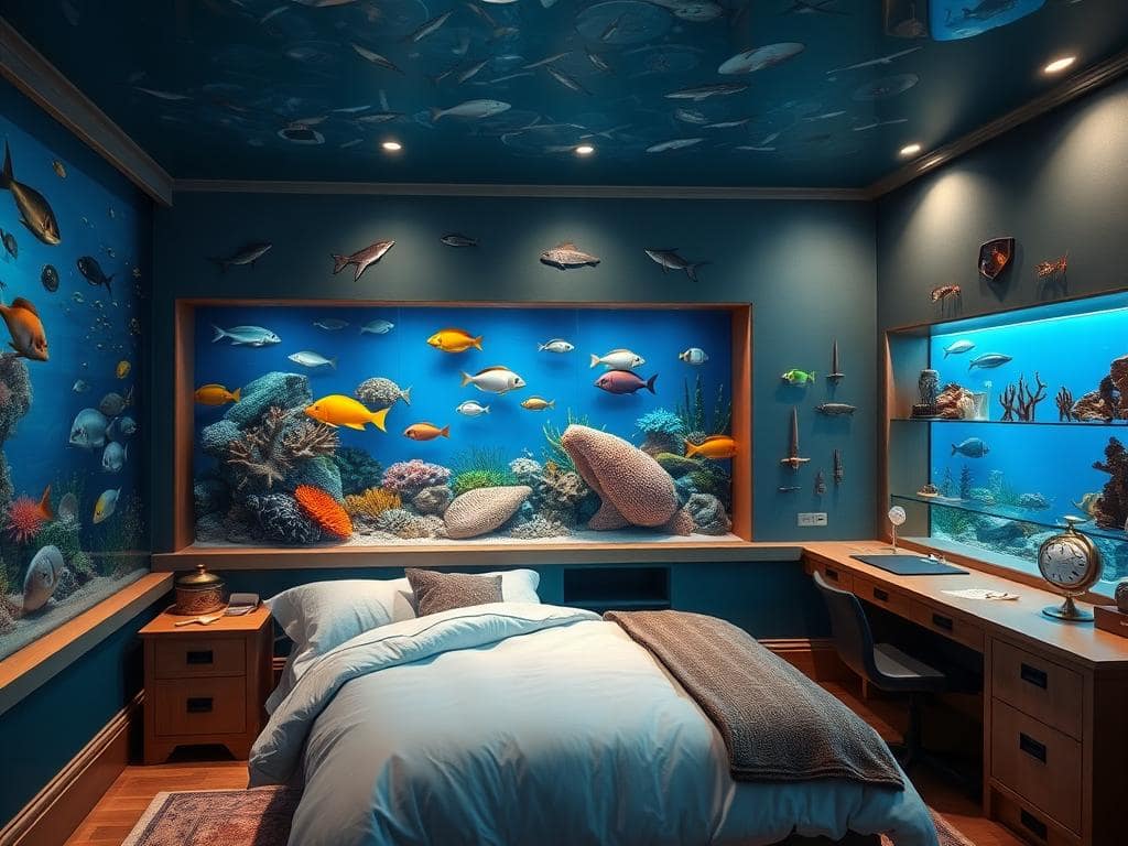 Create an ocean-themed space with aquarium features, marine life artwork, and blue color schemes.