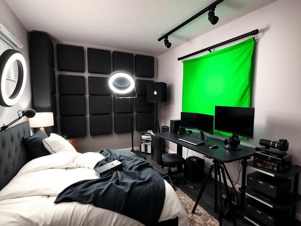 Set up a professional recording space with soundproofing, adjustable lighting, and green screen area.