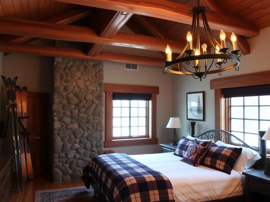 Design a cozy space with timber beam accents, stone veneer features, and rustic lighting fixtures.