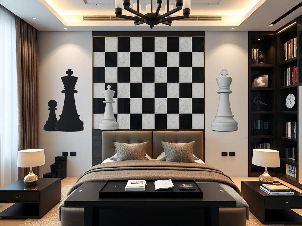 Transform the space with oversized chess motifs, strategy planning area, and tournament preparation zone.