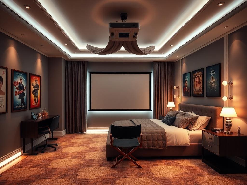 Design a movie-buff paradise with director’s chair, vintage film posters, and professional lighting setup.