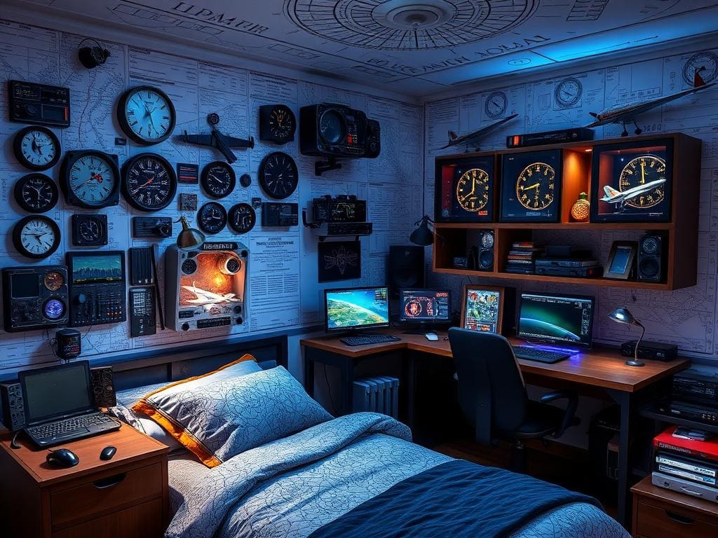 Create a pilot’s dream with aircraft instruments, navigation charts, and flight simulator station.