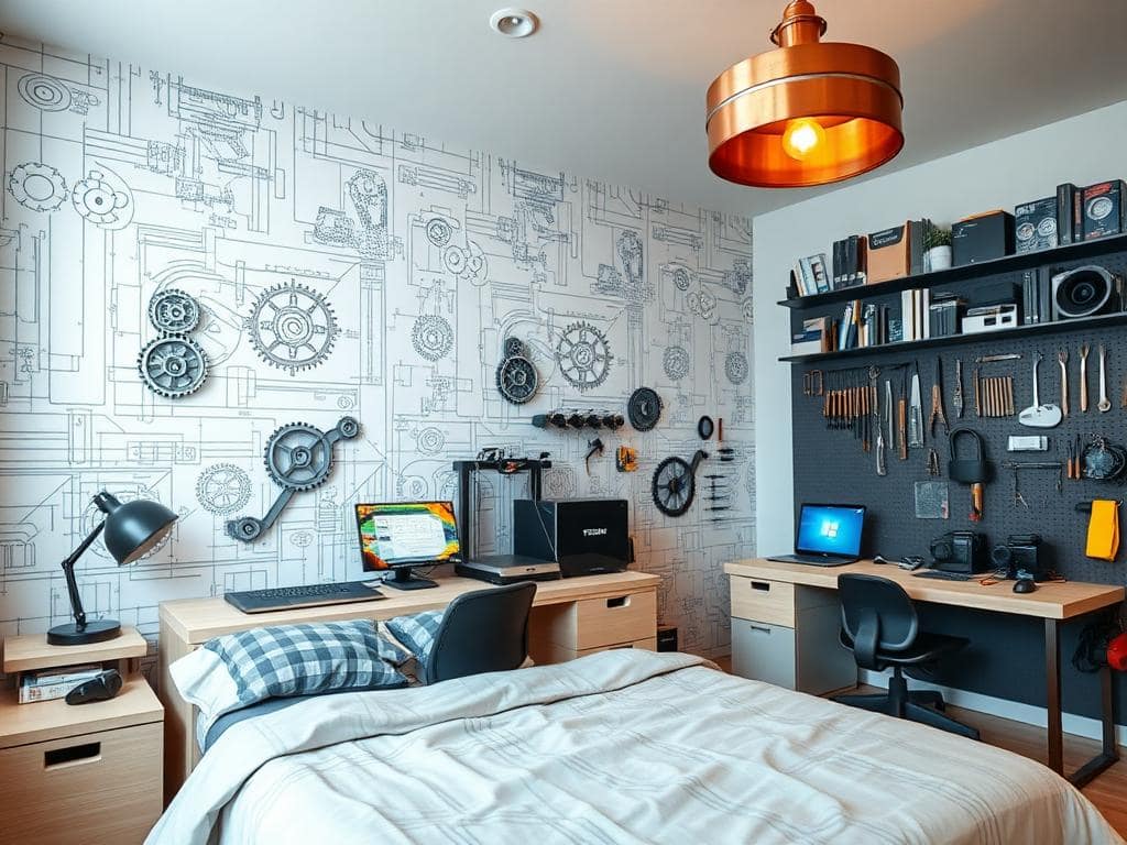 Transform the area with technical drawings, gear-themed elements, and 3D printer station.
