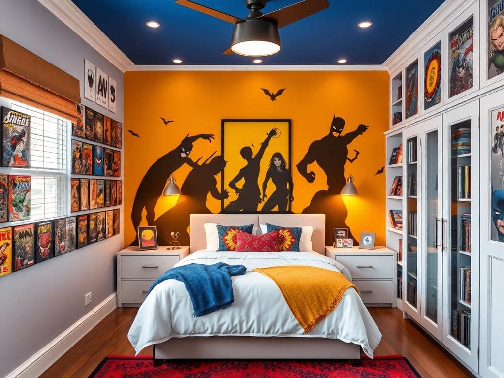 Transform walls into comic panel displays with custom shelving, superhero artwork, and reading nook.