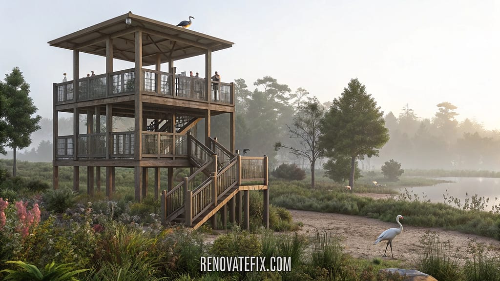 Upper observation post offers commanding water views with telescope station and weather-resistant seating.